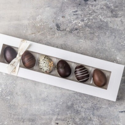 Smukke påskeæg fra Xocolatl i Christiansfeld. Gaveæsken indeholder 6 marcipan-æg med forskellige smage; citron, lakrids, kokos, solbær og ren klassisk marcipan.