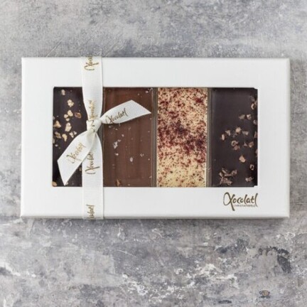 Hos Xocolatl i Christiansfeld laves der virkelig lækker chokolade. I denne æske får du 4 rene chokoladebarer drysset med kærlighed og smag: