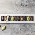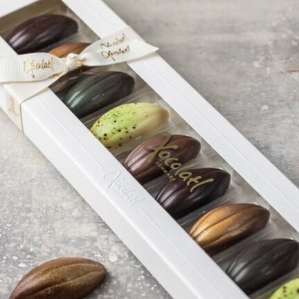 Smuk chokoladeæske med 10 fyldte "kakaofrugter" med saltkaramel, citron, nougat, mint og passionsfrugt.