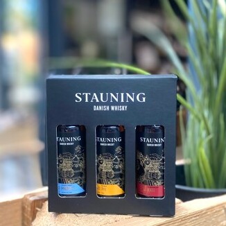 Med Staunings Tasting Box kan du smage 3 forskellige whiskyer, med hver deres smagsprofil; Høst, Rye og Kaos. Stauning Whisky skaber fremragende dansk whisky fra korn til glas, med alle ingredienser hentet i nærheden af deres destilleri i det vestjyske.
